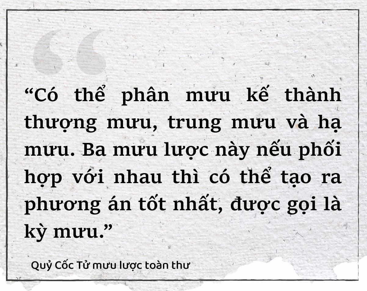 Từ nguyên tắc đó, Quỷ Cốc Tử chia mưu lược thành ba bậc. Thượng sách là kế vô hình, khiến việc thành công mà không để lại dấu vết. Trung sách là kế hữu hình, mang lại kết quả mong muốn nhưng vẫn để lại dấu vết, thường được ca ngợi. Hạ sách là kế bất đắc dĩ, giải quyết tình huống khó khăn nhưng hao tổn nhiều nhân lực và vật lực. Người giỏi mưu cần biết kết hợp cả ba bậc để tạo nên giải pháp chu toàn.